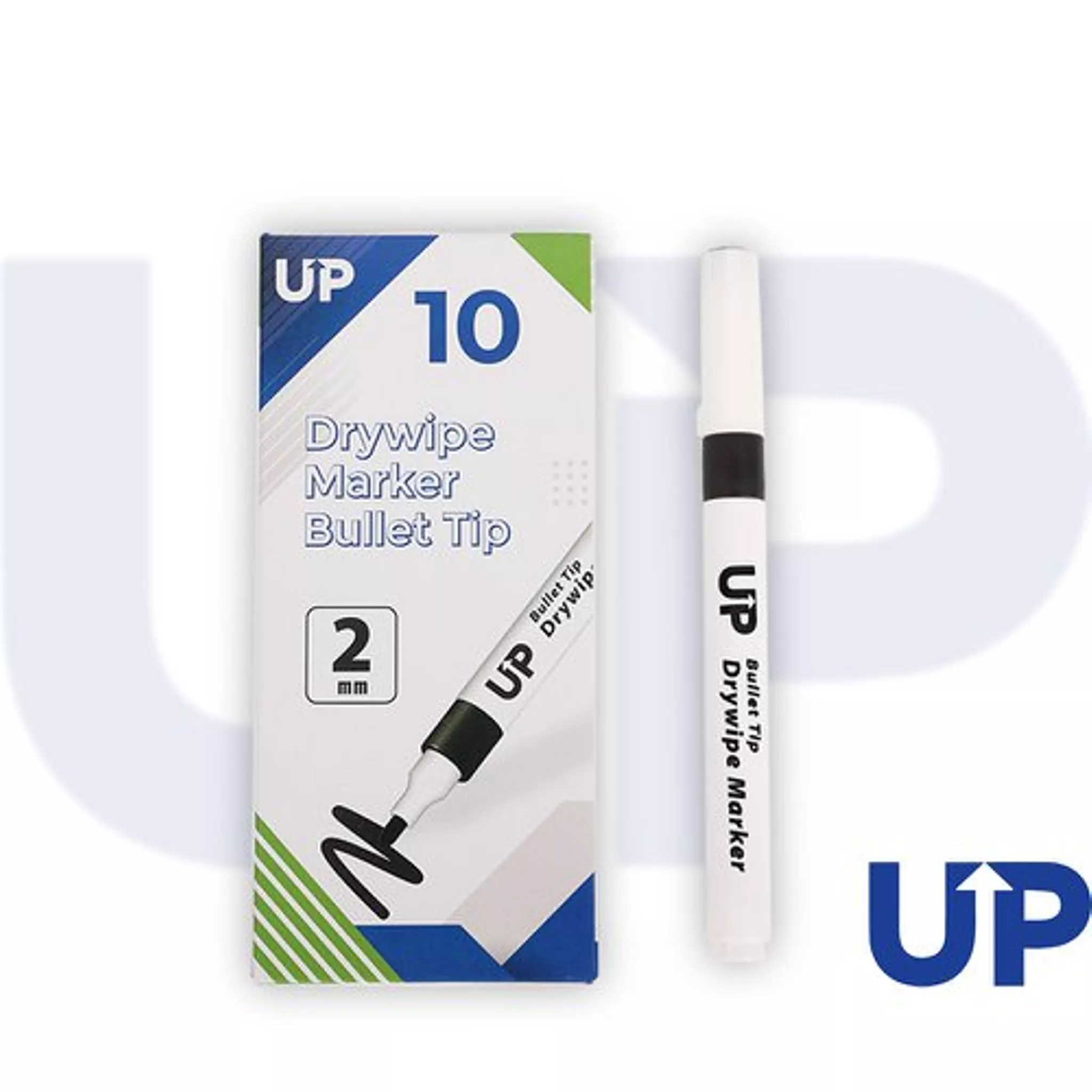 This great value pack contains 10 drywipe markers in black ink. Each marker has a bullet shaped nib which writes with a 2.0mm line for bold mark making that wipes off with ease.